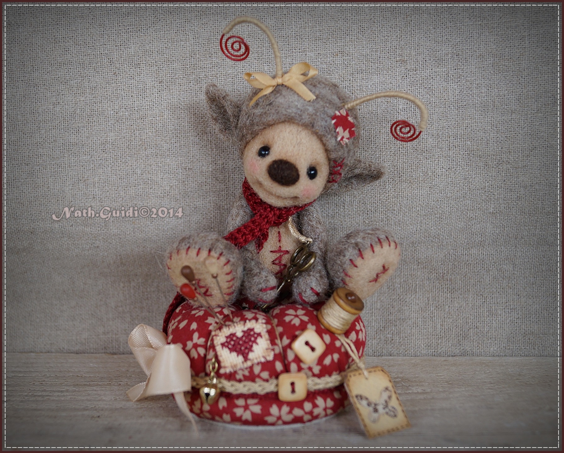 Cette petite créature est précieuse, il faut en prendre soin et vous donnera en retour beaucoup de tendresse: c’est fait à partir de pelotes de laine cardée à l’aiguille et aux couleurs chatoyantes et longuement sculptées et feutrées avec soin et attention, selon différentes techniques, bien souvent en pièce unique. Et puis s’assise sur un coussin que est réalisé comme un pouf dont le socle est rigide et le tissu japonisant, imprimé de belles arabesques écrues et dorées