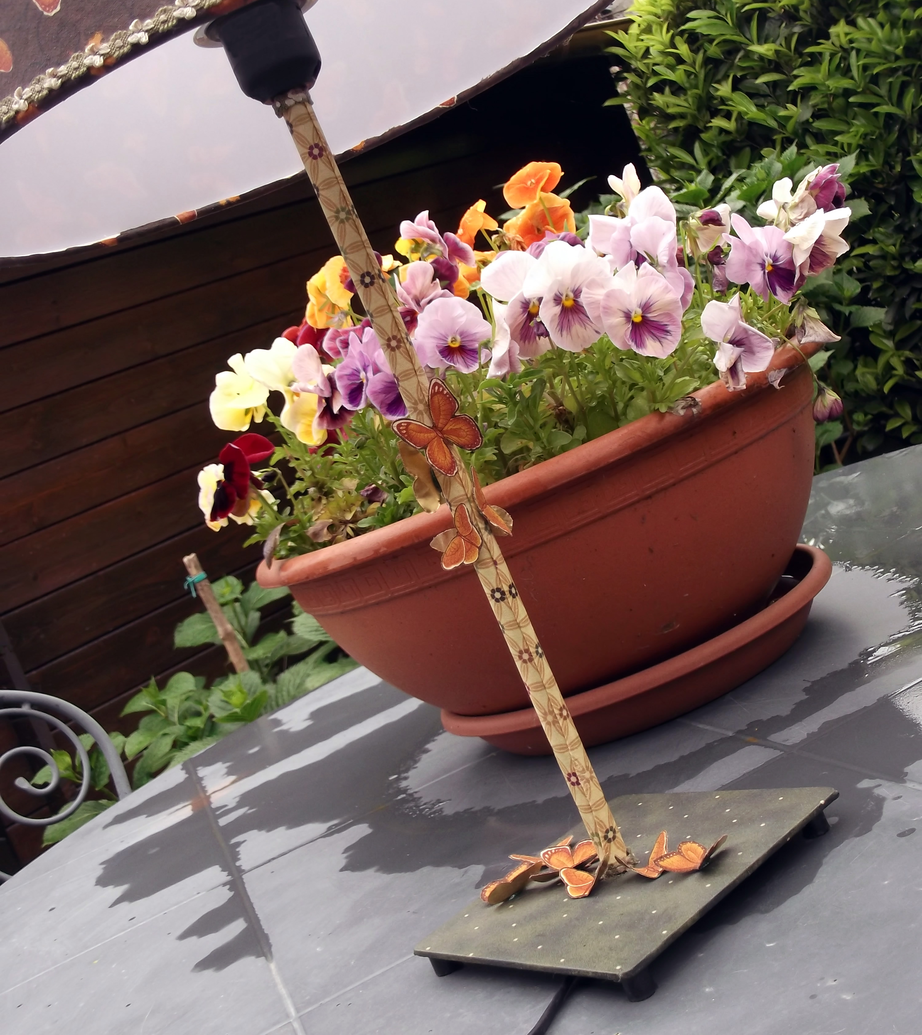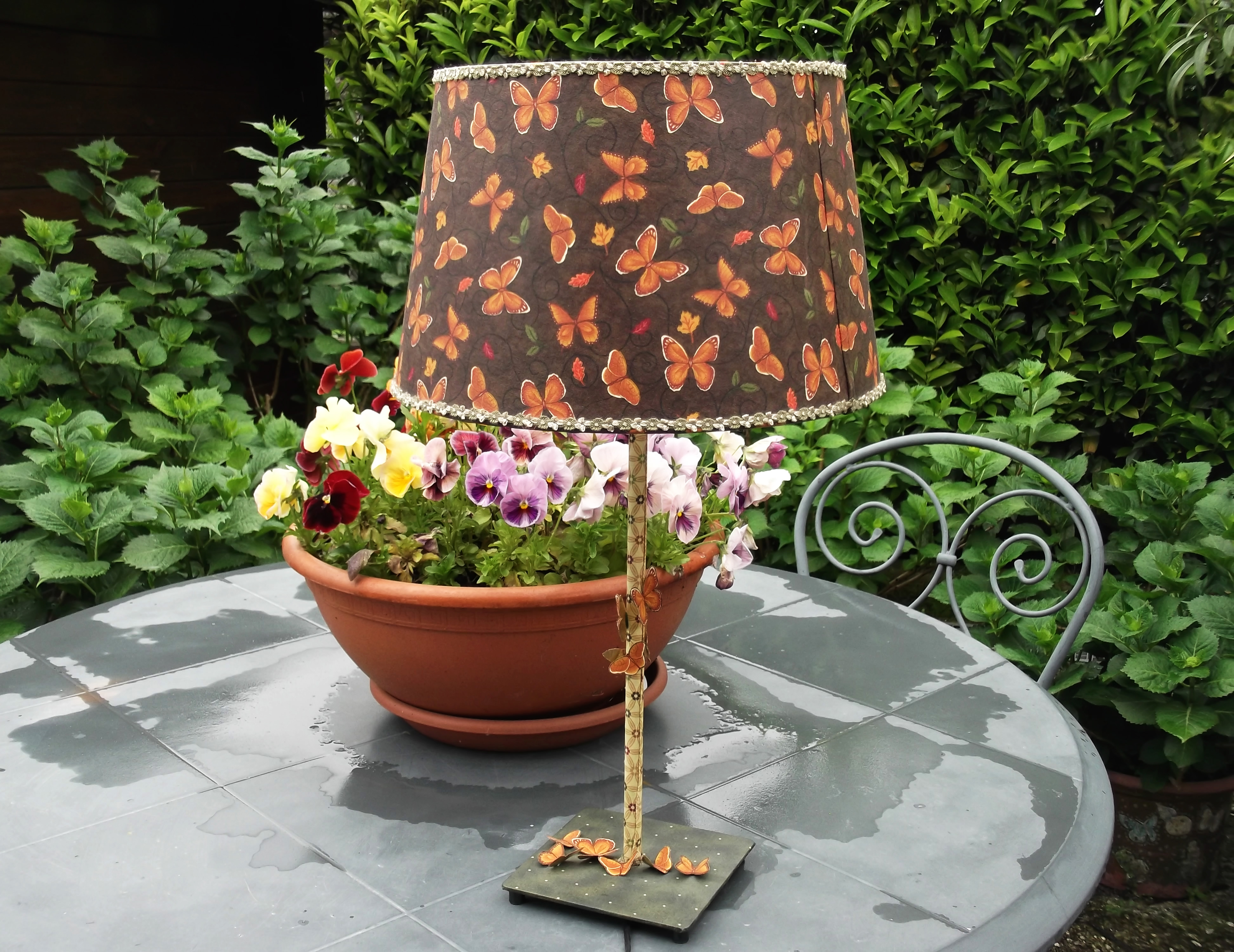 La lampada è scenografica, con le sue farfalle sparse sulla base e sulla piantana, e country nel suo stile, con colori autunnali, marrone e arancio, su un antico comodino in legno a illuminare lievemente un angolo della sala da pranzo: regalo alla suocera 😛
