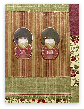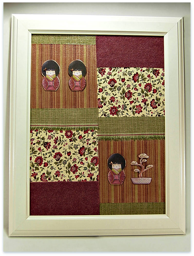 Beautiful japanese 100% cotton fabric and Kokeshi soft-paper dolls and small tree. What an idea for a unique birthday gift: to decorate a 30×40 cm. canvas with the decoupage technique. First of all I need a soft pencil to design the template on the canvas front side, the scissors to cut out my fabric symmetrically and vinyl glue (or special fabric-glue). Also a flat brush to spread an adequate glue measure on to paste the ten fabric pieces, my fingers to hold and press the fabric down while it dries. Then I use a satin water-based varnish gel to create a protective finishing. I apply a thin uniform coat with a specific smooth flat brush twice, or three times, and let dry for at least six hours. Finally, I paste the japanese Kokeshi soft-paper dolls and small tree to the copper lamina and cut them out carefully. I glue them with hot-melt adhesive by a hot-glue gun directly to my fabric. To embellish I choose a white wooden frame.
